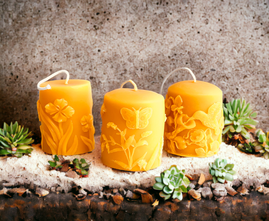 Set of 3 Embossed Beeswax Pillar Candles - Wildflower, Butterfly, Hummingbird