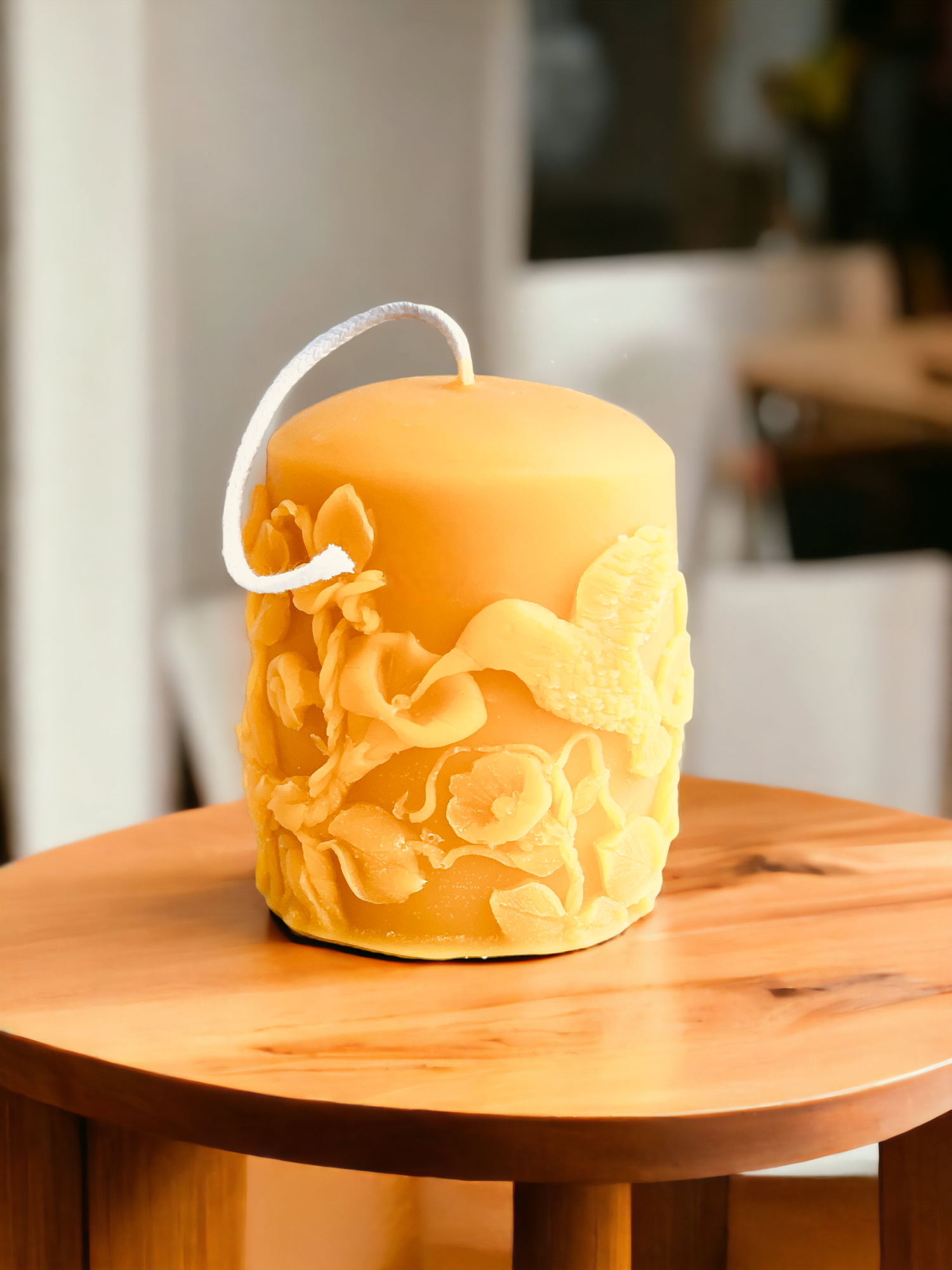 Introducing our exquisite Hummingbird Embossed Beeswax Pillar Candle, a true testament to the wonders of nature. With its stunning design and natural composition, finding candles as unique and remarkable as these in your usual store candle aisle is a rare occurrence. Whether you're seeking to enhance your spring/summer decor or simply adore the beauty of birds, flowers, and the great outdoors, this candle is the perfect addition.