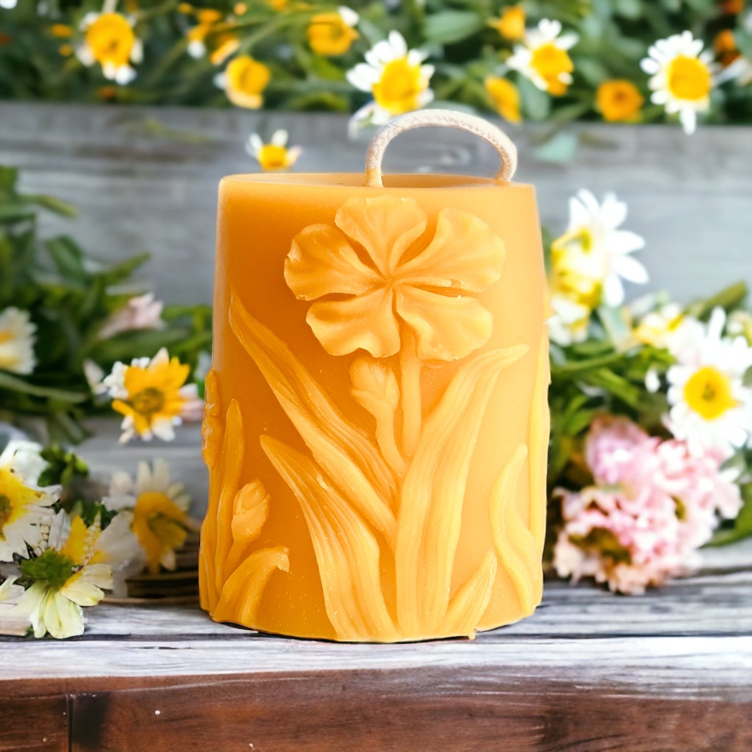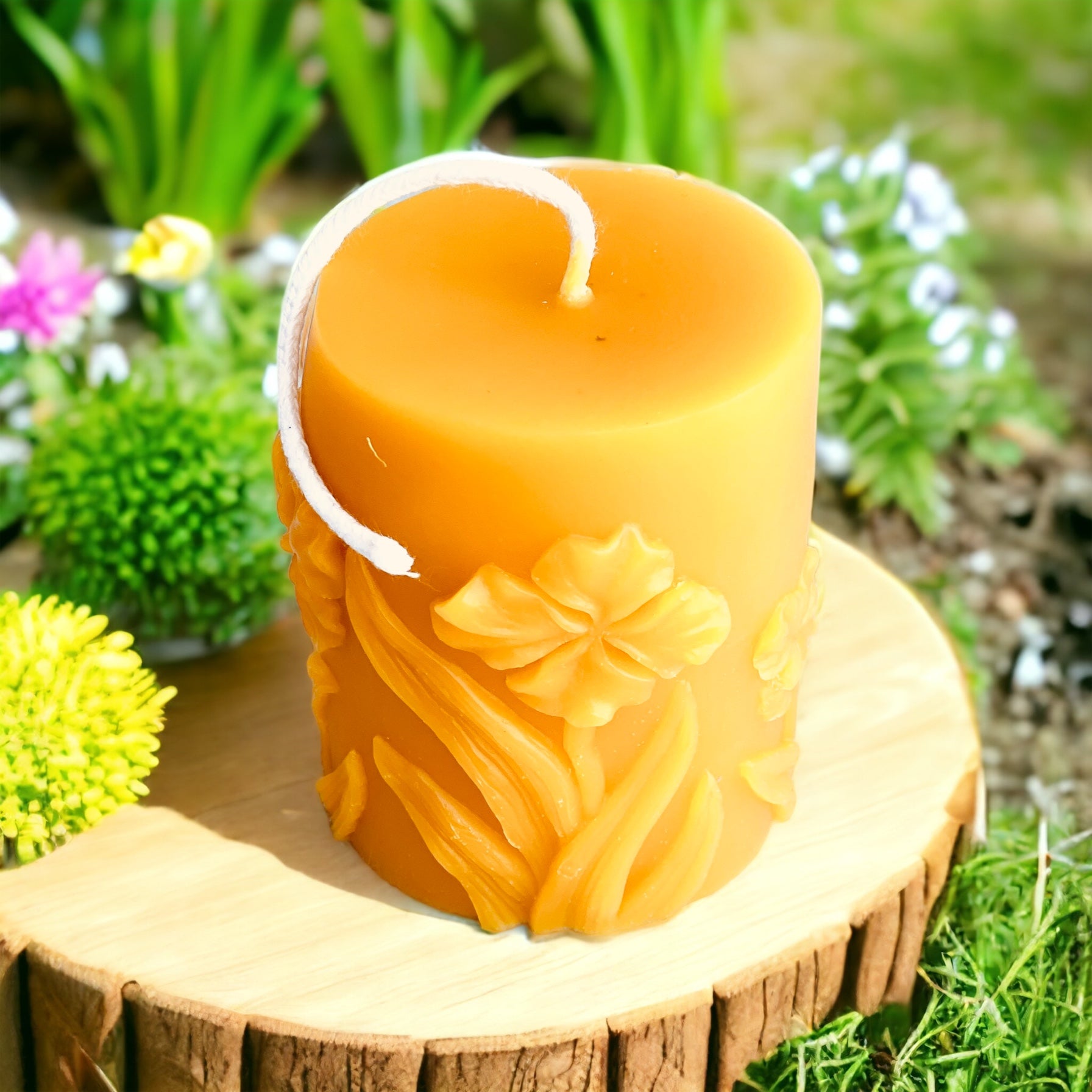 Introducing our exquisite Wildflower Embossed Beeswax Pillar Candle, a stunning tribute to the beauty of nature. These unique and natural candles are a rare find in your typical store candle aisle. Whether you're looking to enhance your spring/summer decor or simply adore the wonders of nature, these candles are the perfect addition. Standing at approximately 3" inches in height (see exact measurements below), they offer a compact size that can be displayed anywhere, adding a touch of natural and earthy elegance to your space while captivating attention.