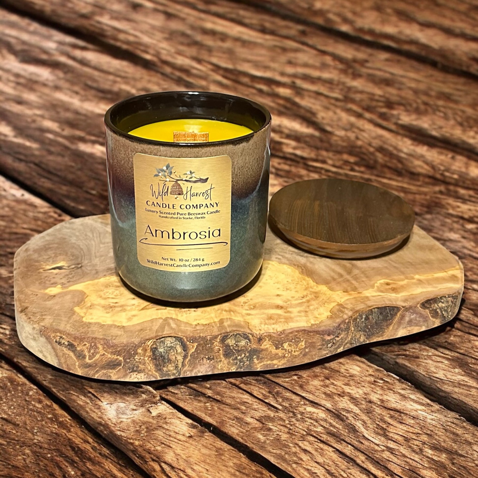 Ambrosia Scented Beeswax Candle – 10 oz | Amber, Shea Butter & Sandalwood | Crackling Wood Wick in Elements Ceramic Jar