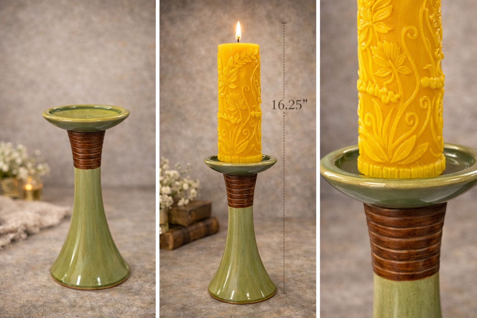 Bring warmth, texture, and natural beauty into your space with this thoughtfully curated candle set, featuring a handcrafted pure beeswax fern pillar paired with a sculptural ceramic pedestal candle holder.