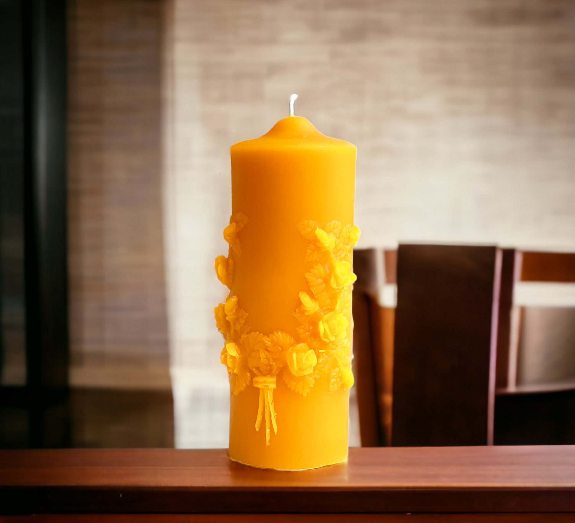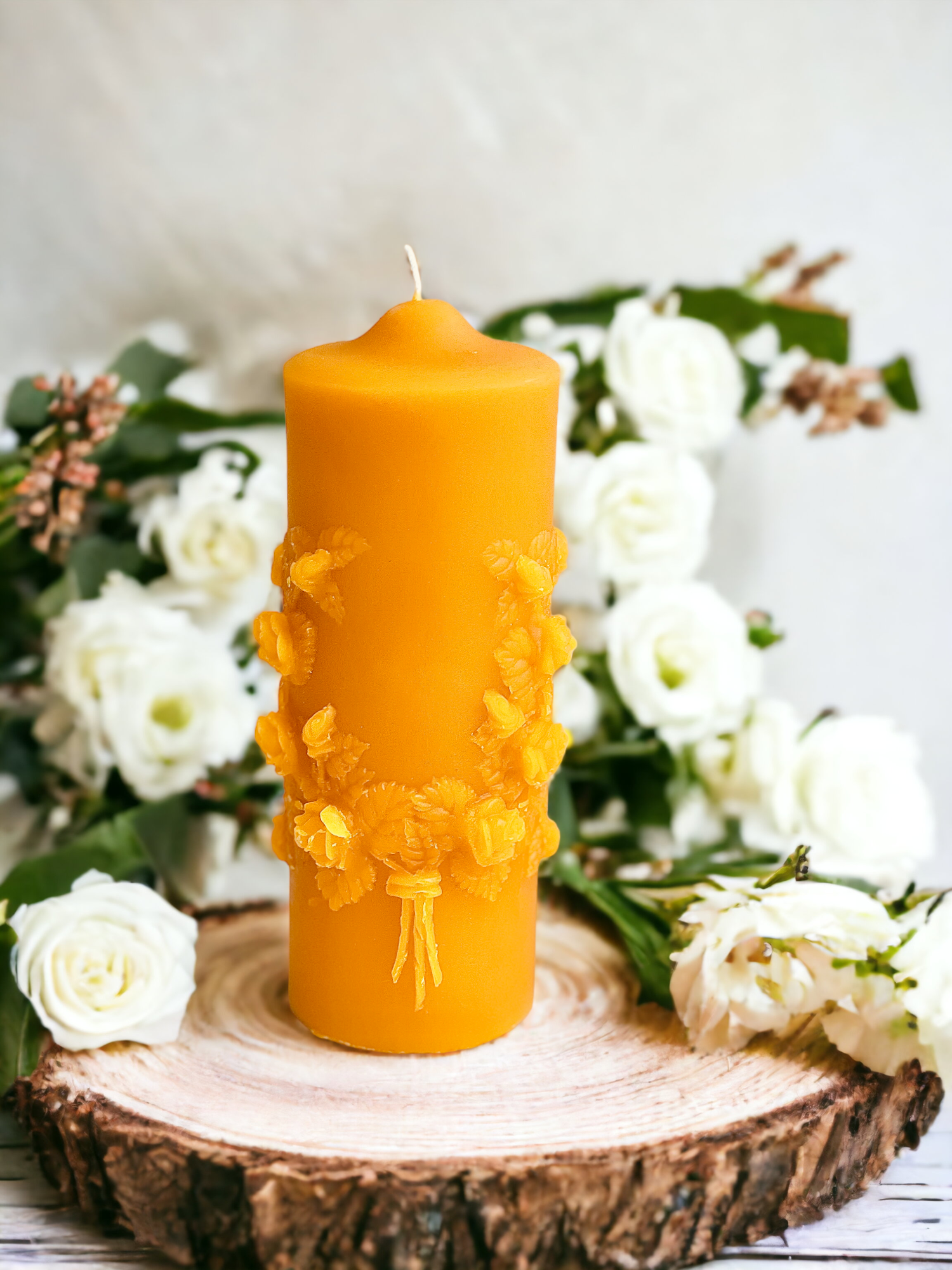 A gorgeous taper-top Floral Wreath Pillar Pure Beeswax Candle, embossed with a crown of roses on the front. A great gift idea for birthdays, anniversaries, wedding gifts, or a simple gesture to let someone know that you care for them and are thinking of them!