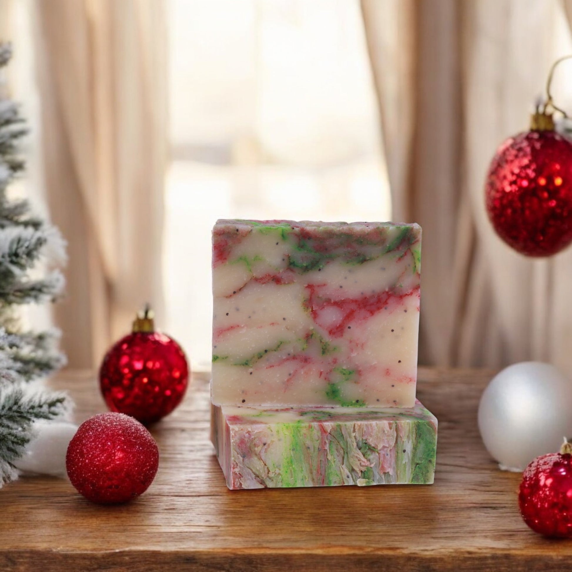 ~Ingredients: Saponified Oils (Olive Oil, Organic Palm Oil**, Organic Coconut Oil*, Organic Shea Butter*), Fragrance, Poppy Seeds, Dye, Red Lake 40, Chromium Oxide. **Fair Trade, Sustainable-Palm Done Right, *Fair Trade