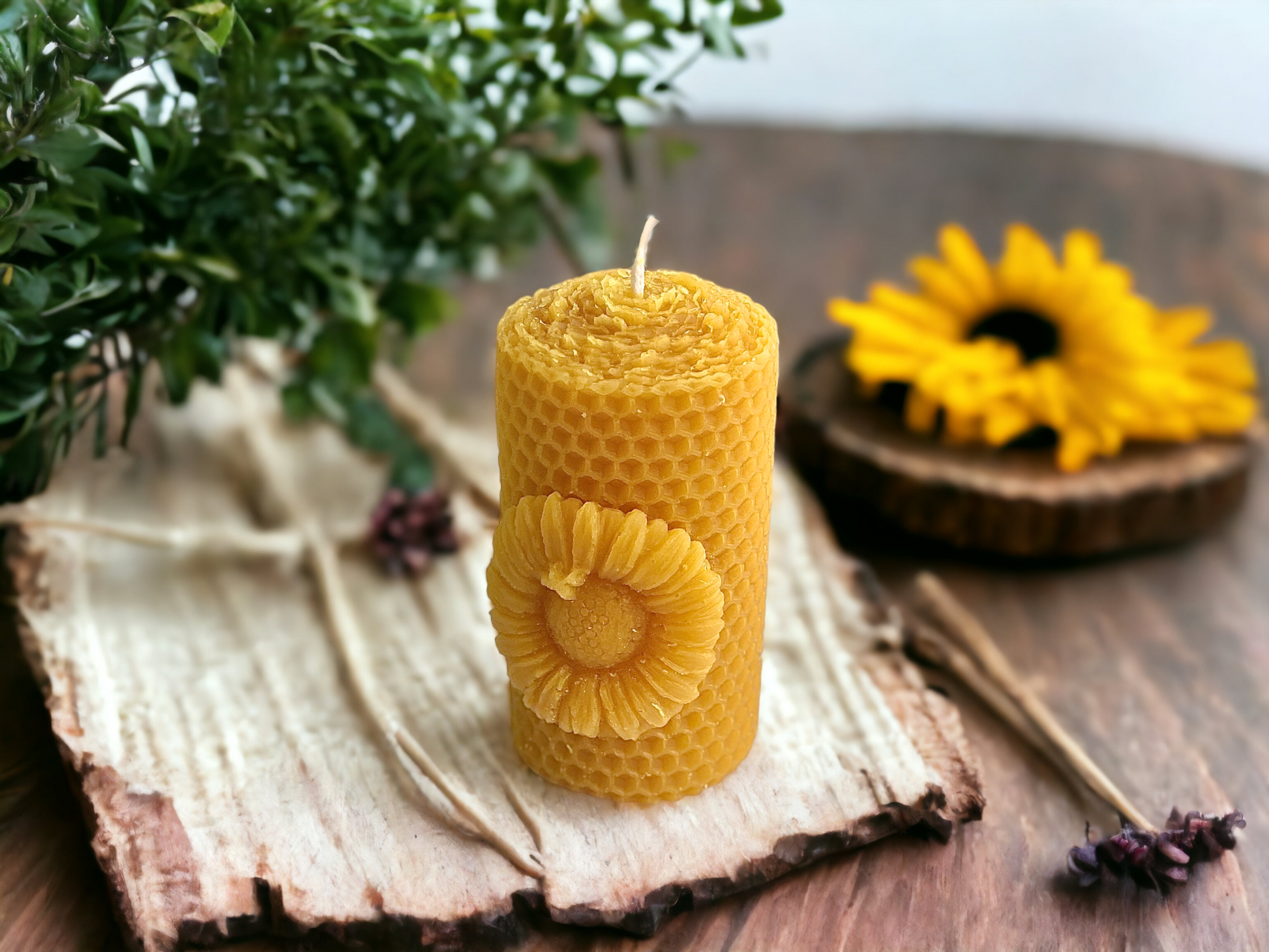 Echoing memories of the past, this rustic candle emulates the method in which beeswax candles were used to light up the world for over a millennia; a flat beeswax sheet with a wick rolled into a candle. With a beautiful, bright sunflower accompanied by its very own buzzing bee, this unique pillar has a honeycomb texture that you can feel in your hands. You can see the appareance of the crinkle of the rolled sheets on the head and back of this candle, making for a charismatic addition wherever you place this. Great idea for lovers of decorative candles, or to use as a housewarming gift, gift for mom, birthday gift, etc.