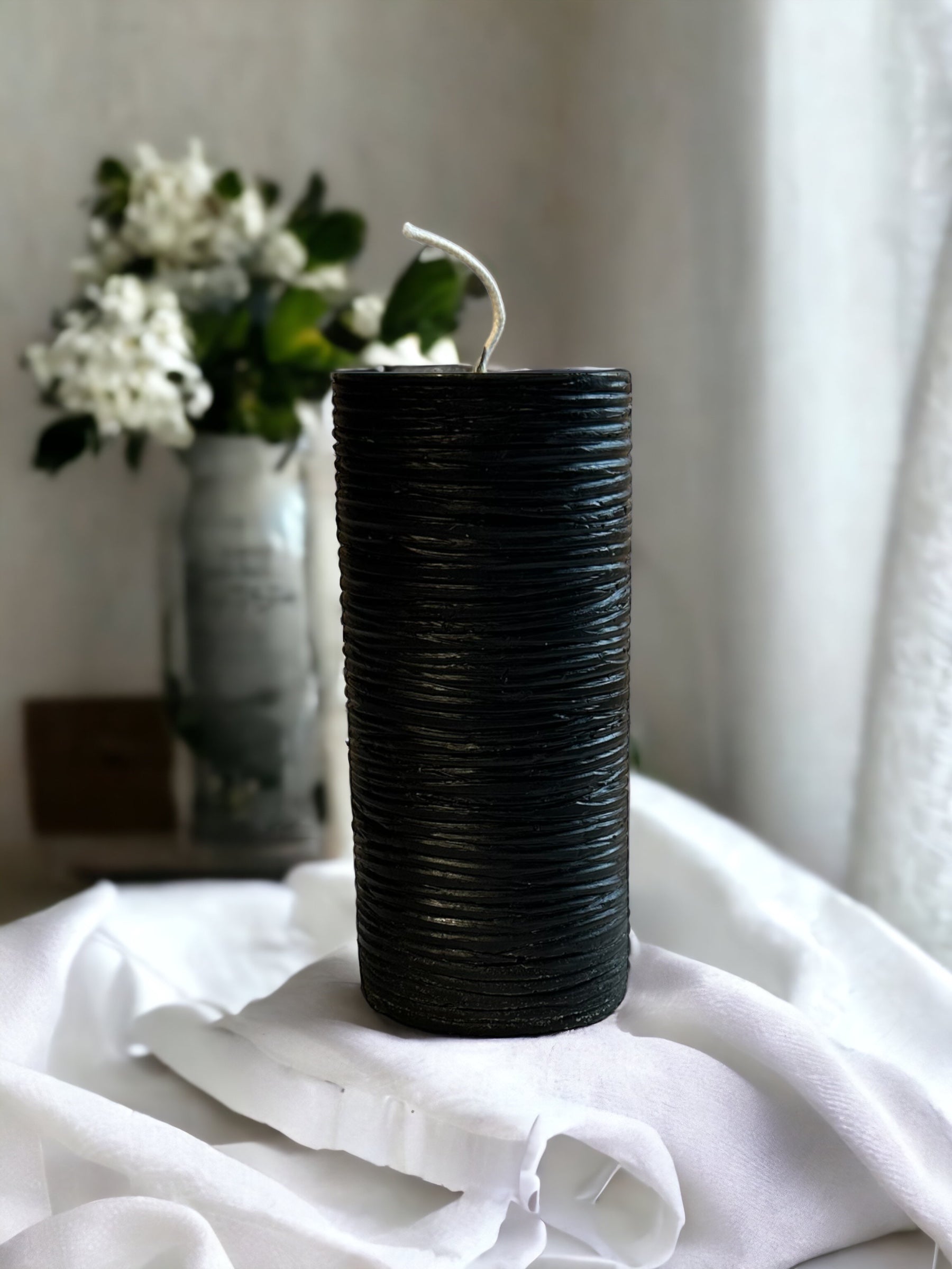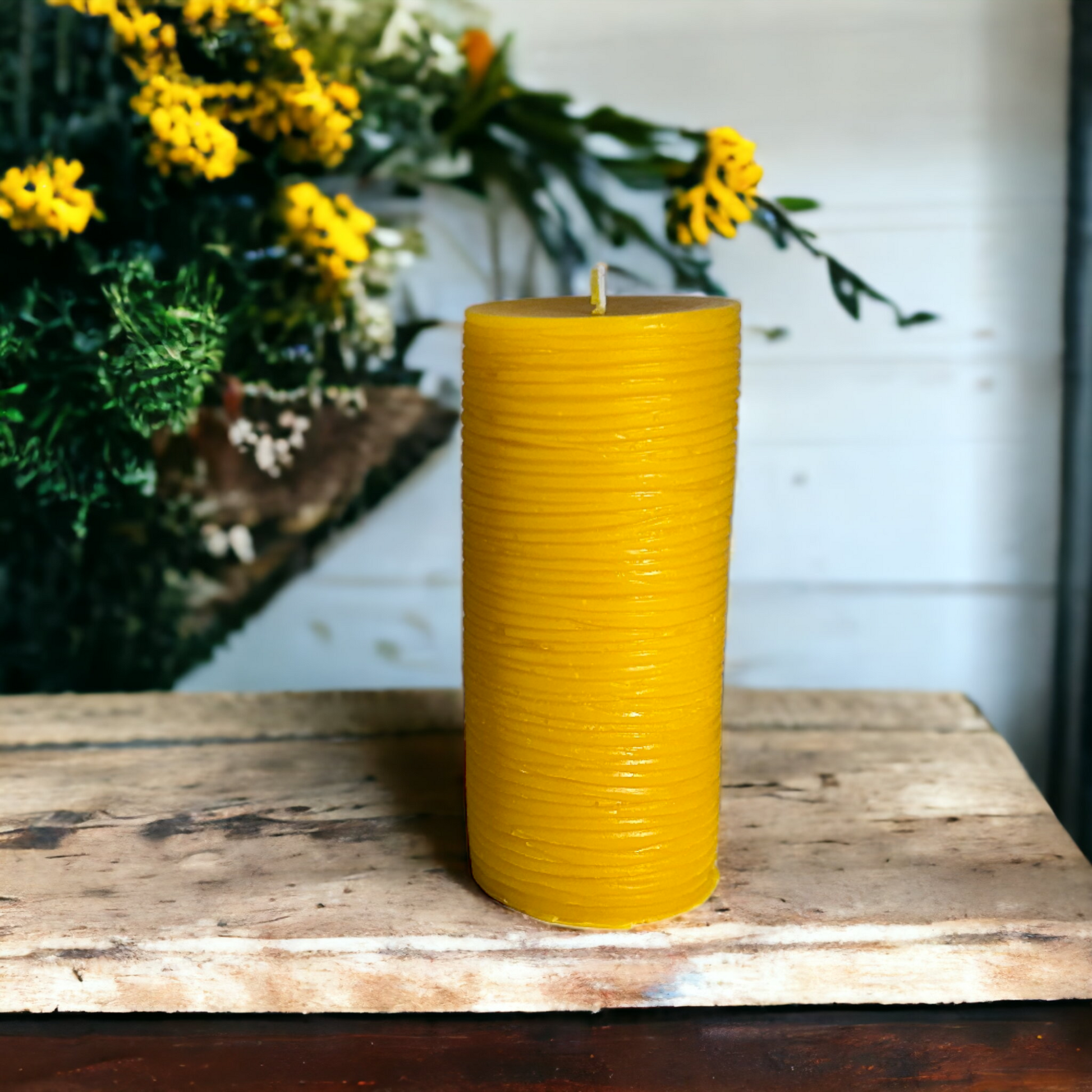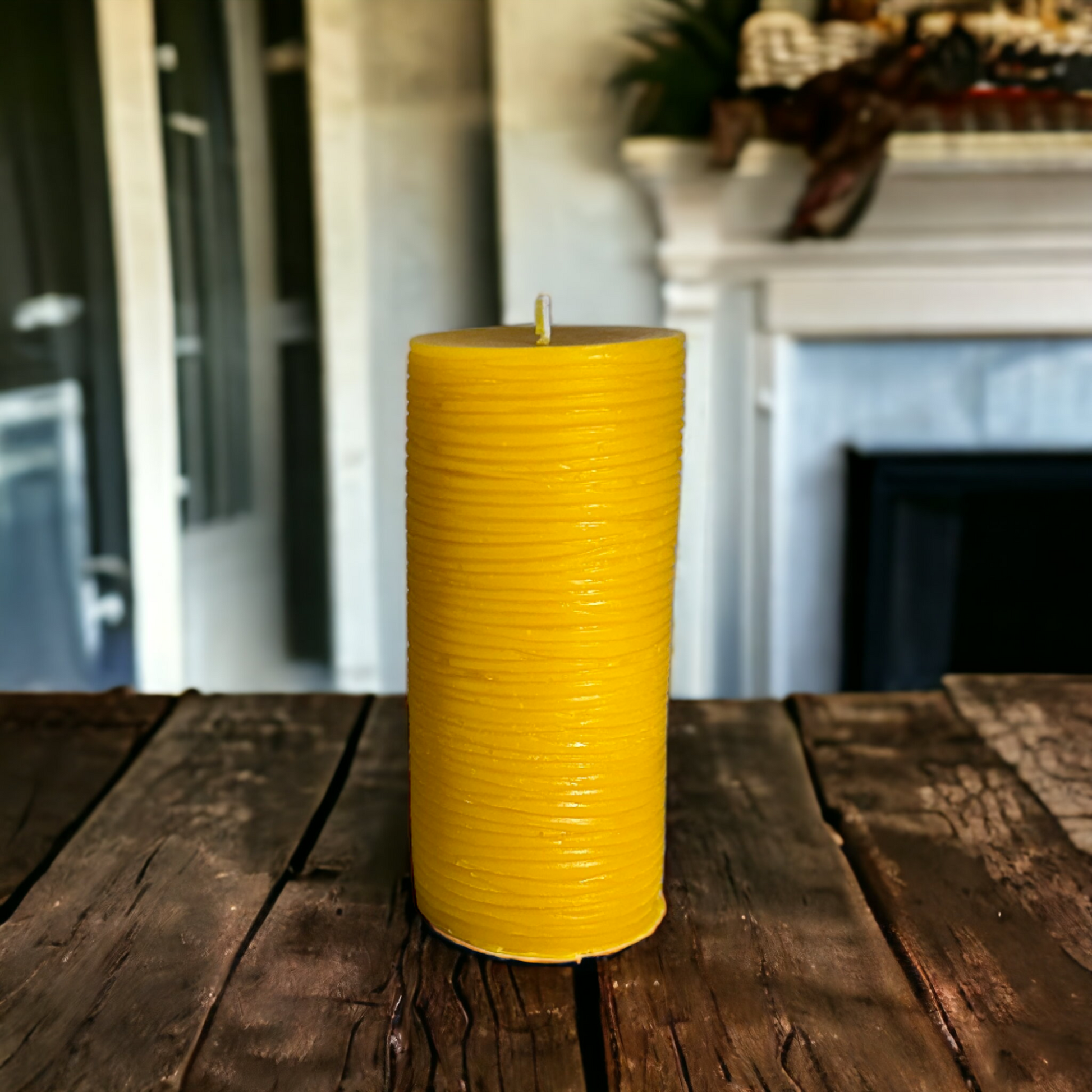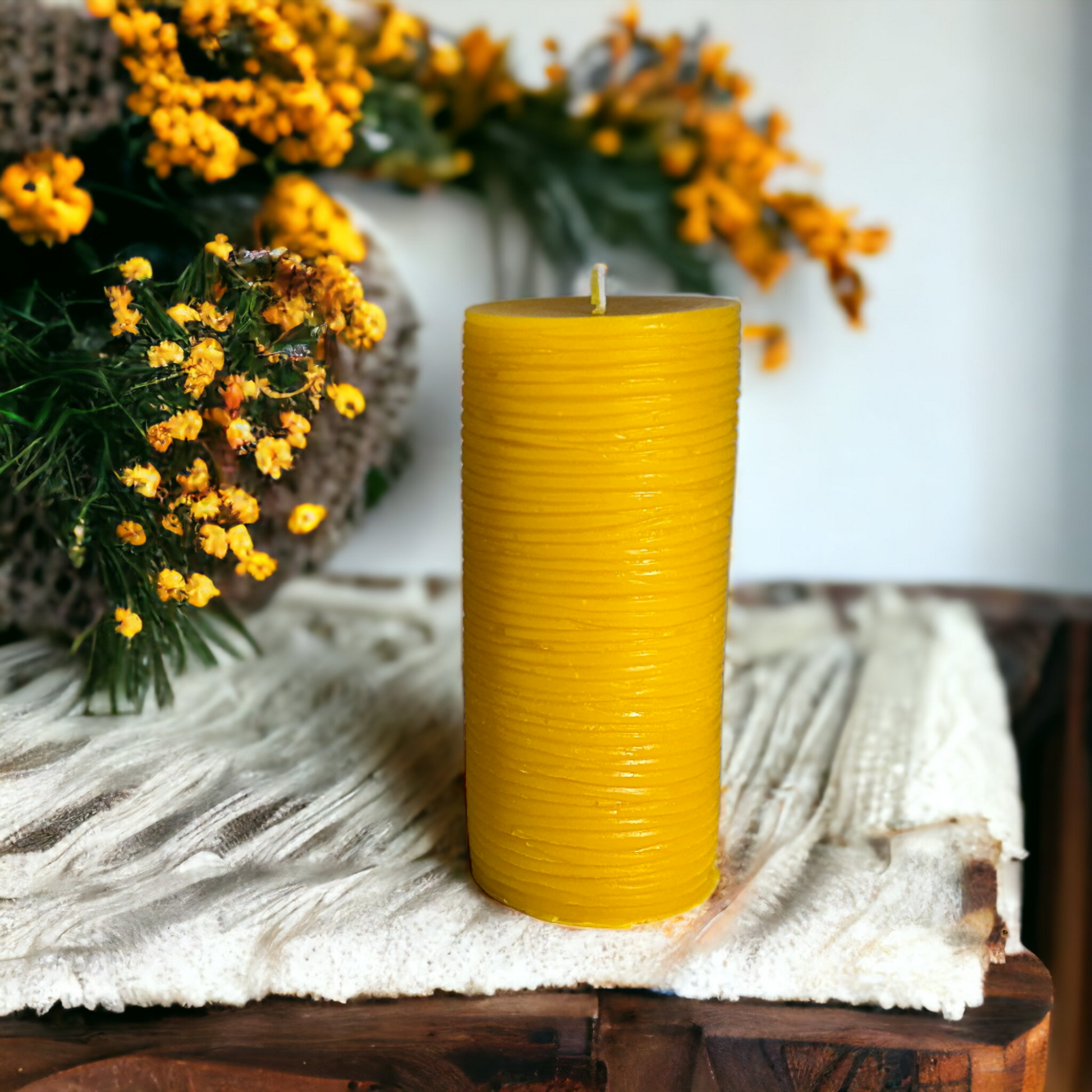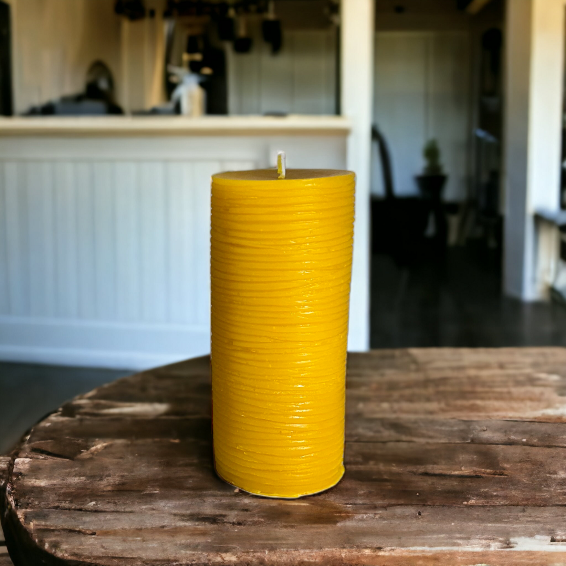 Elevate your ambiance with our exquisite 100% pure beeswax pillar candle, meticulously crafted and designed to captivate. Measuring 2" in width and 5" in height, and at 13.6 oz, this candle boasts a chic horizontal textured pattern that adds a touch of artistry to any space.