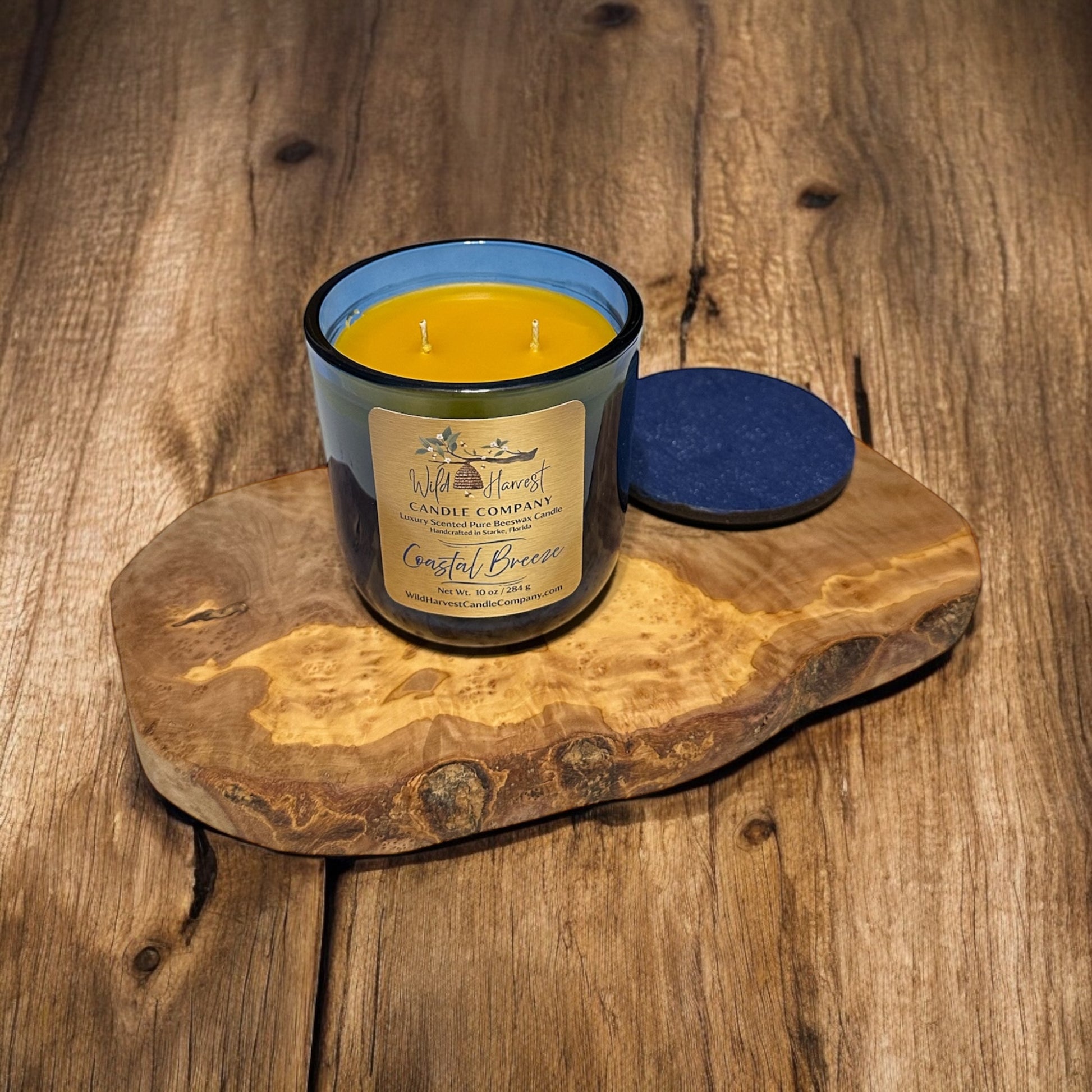 Coastal Breeze Luxury Beeswax Candle – 10 oz Blue Serafina Glass Jar with Blue Wood Lid | Double Hemp Wicks, Clean Burning Ocean-Inspired Scent