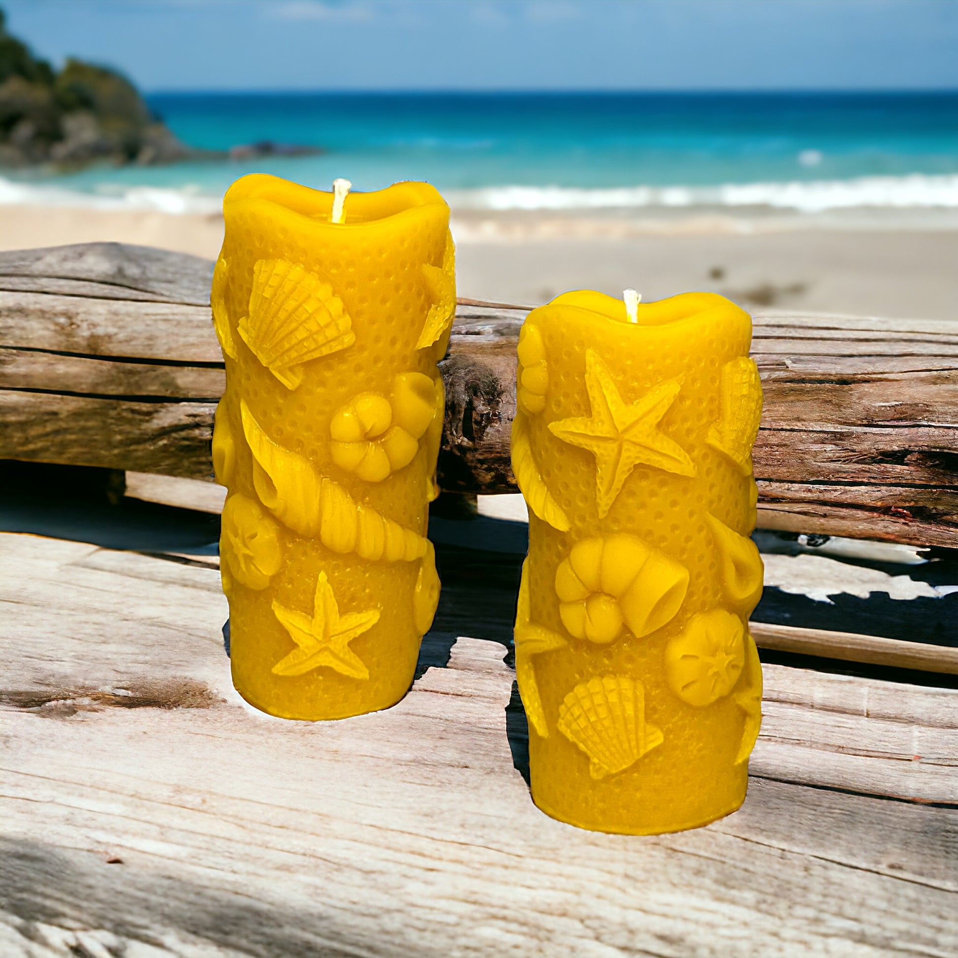 Indulge in the enchanting ambiance of coastal serenity with our Ocean Shell Conch Starfish Beach Theme Pure Beeswax Candle Set of 2.
